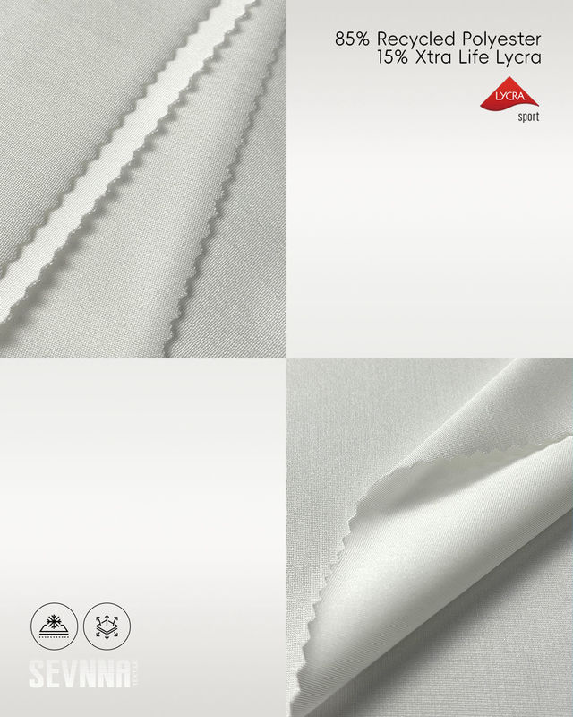 Mit einer Zusammensetzung aus 85% recyceltem Polyester und 15% Xtra Life Lycra sind diese Stretch-Garn-Lycra-Gewebe nicht nur umweltfreundlich, sondern auch langlebig.Das Gewebe ist bekannt dafür, dass es nach mehrfacher Wäsche seine Form und Farbe behalten kann, so dass es eine zuverlässige Wahl für Designer von Sportbekleidung ist.